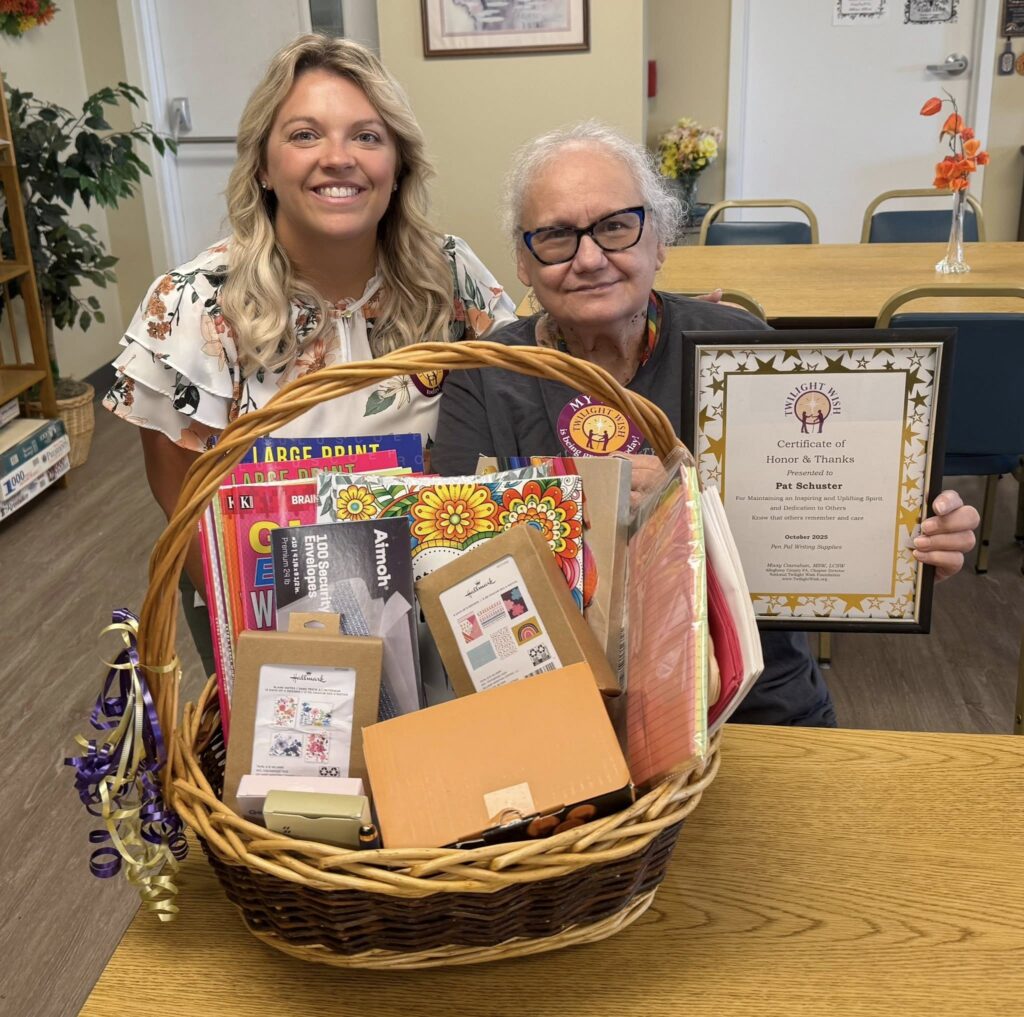Patricia loves to write and began writing letters to pen pals when she was a young girl. Now 73, she is still at it, writing to widows/widowers, long-distance family members and those who are lonely and need companionship. Patricia also enjoys adult coloring books and word searches but had to cancel her monthly word search book subscription due to her financial situation. She is an ordained minister who provides pastoral care in her building and also taught Sunday School for many years. Patricia’s simple and heartfelt wish for writing supplies, stamps and coloring and word search books was recently granted, thanks to our Allegheny County chapter.