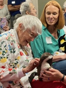 Bertha Komor, a resident of Village Gate of Farmington, had her wish to pet a penguin granted, thanks to our Central Connecticut chapter. Komor, who will turn 105 in December, has been a resident of Village Gate at Farmington for several years. Her husband passed away after 72 years of marriage together. When Komor was younger and more mobile, she helped with activities and other residents in the facility. Komor is well known throughout Village Gate for being caring and kind to everyone she meets. When asked why she wants to pet a penguin, she replied “because they are adorable and my favorite animal!” Thank you to Mystic Aquarium for helping to grant this very special wish!