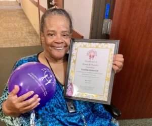 Cynthia Guinyard, 76, a resident of Pittsburgh, Pennsylvania, had her wish for a new love seat granted, thanks to our Allegheny County chapter. Guinyard only had an old sofa that had been given to her secondhand and it was falling apart. She could not afford a new one on her limited income so was thrilled to have this simple wish granted.