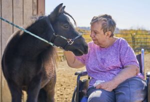 Helen Kasing, a 69-year-old living at Lutheran SeniorLife Passavant in Zelienople, Pennsylvania had her wish to pet and “ride” a horse again granted by our Butler County chapter. Kasing grew up with horses and owned three at one time. She missed being around horses and was thrilled to be entertained by Koda, a mini horse, and taken for a carriage ride by Bella.