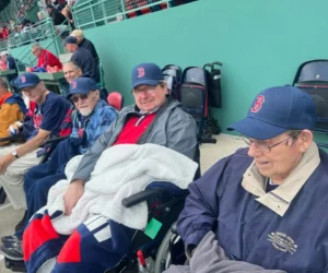 Four elderly residents of The Green House Project at Saint Elizabeth Community in East Greenwich, Rhode Island had their wish to attend a Red Sox game at Fenway Park granted, thanks to our Rhode Island chapter. All four men are die-hard Red Sox fans and range in age from 70 to 92. Although they all have medical issues and require wheelchairs to get around, they share a love of baseball and the Red Sox. As part of their wish, Red Sox alumni Sam Horn visited them at their facility, sharing baseball stories and signing autographs for them.