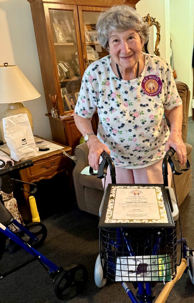 Carmella’s simple wish for a compact walker was granted by our Allegheny County chapter recently. Carmella, 93, lives on her own. She loves to go out with her family but it is difficult to navigate with her rollator as it is heavy to get in and out of the car. Having a small walker will make it much easier for Carmella to go to the doctor and on outings with her family. She has volunteered at her church for over 60 years and also volunteers at the senior center. Carmella’s smile says it all!